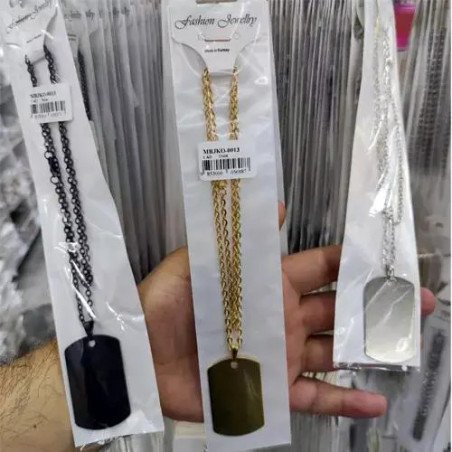 Toptan metal zincirli kare plaka kolyeler, lazer yazıya ve baskıya uygun modellerdir. Paslanmaya ve kararmaya karşı dayanıklı metalden imal edilmiştir.